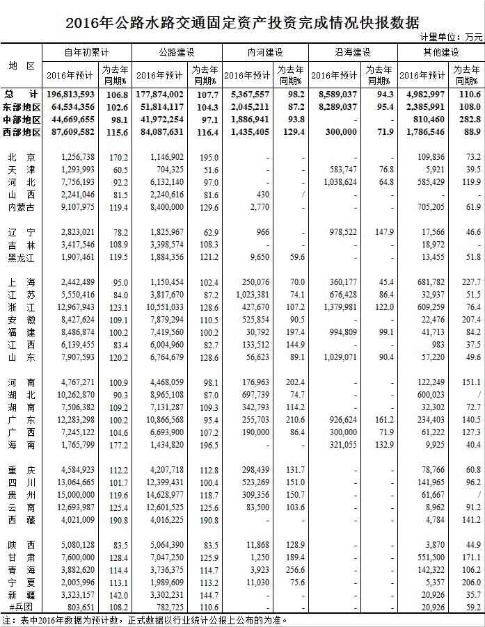2016年公路水路交通固定資產(chǎn)投資完成情況快報(bào)數(shù)據(jù)