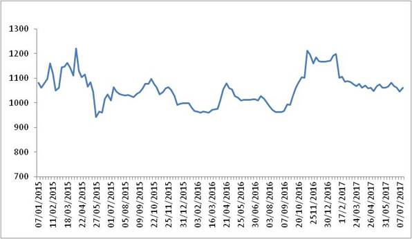 圖 1 2015-2017年各周中國公路物流運(yùn)價(jià)指數(shù)